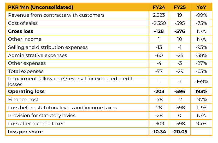 Saritow Spinning Mills Limited (SSML) reported loss per share of PKR 20.05 for FY25, compared to loss per share of PKR 10.34 in FY24.