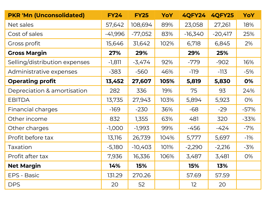 Sazgar Engineering Works Limited (SAZEW) reported earnings per share of PKR 270.26 for FY25, compared to earnings per share of PKR 131.29 in FY24. Furthermore, in 4QFY25, the company reported earnings per share of PKR 57.59, compared to earnings per share of PKR 57.69 in the same period last year (SPLY). The company’s actual output is running closer to 60 vehicles per day, compared to its installed capacity of 40. Following the planned expansion, management expects single-shift capacity to rise to 100–120 vehicles per day, with the enhanced facility designed to assemble the complete model range, including NEVs, hybrids, EVs, and petrol variants.