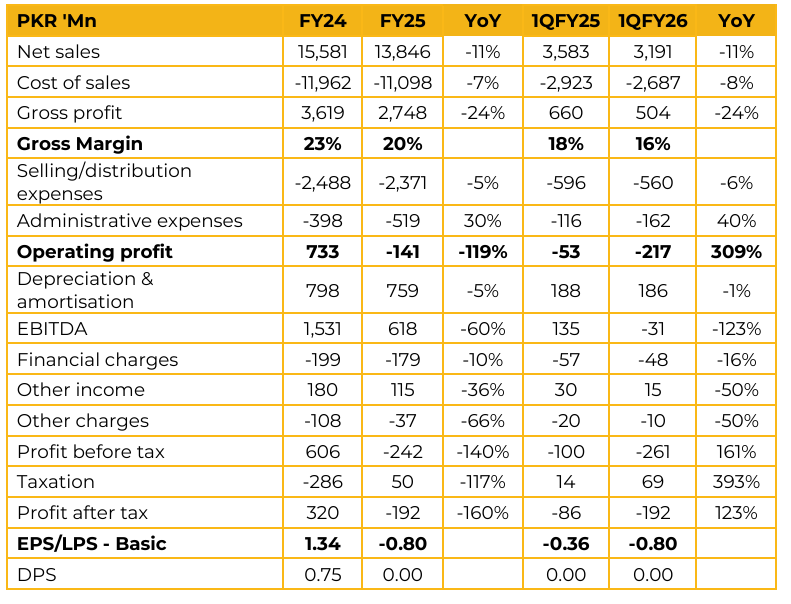 Shabbir Tiles & Ceramics Limited (STCL) reported loss per share of PKR 0.80 for FY25, compared to earnings per share of PKR 1.34 in FY24. Furthermore, in 1QFY26, the company reported loss per share of PKR 0.80, compared to loss per share of PKR 0.36 in the same period last year (SPLY). Sales volume declined to 8.33 mn sqm in FY25, down from 10.39 mn sqm in FY24, as the topline remained under pressure amid a slowdown in the construction sector.