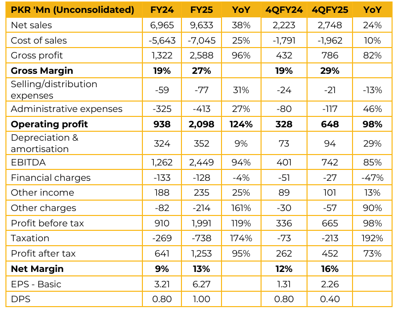 SPEL Limited (SPEL) reported earnings per share of PKR 6.27 for FY25, compared to PKR 3.21 in FY24. Furthermore, in 4QFY25, the company reported earnings per share of PKR 2.26, compared to earnings per share of PKR 1.31 in the same period last year (SPLY).