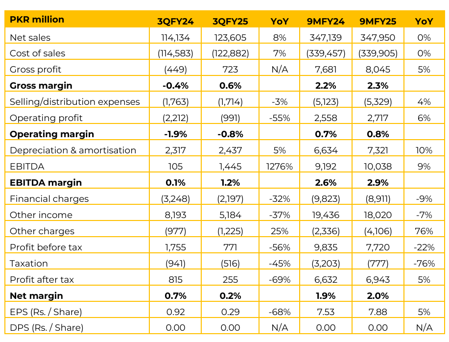 SSGC reported profit after tax of PKR 6.9 billion in 9MFY25 (EPS: PKR 7.88) compared to PKR 6.6 billion (EPS: PKR 7.53) in SPLY. Company’s current sales mix comprises of 49.2% to domestic, 19.5% to process industries, 15.4% to captive power, 11.2% to fertilizer, 3.1% to power generation and remaining to others. SSGC has made visible progress in reducing UFG, bringing it down from 16.6% in FY23 to 10.6% in FY24, saving ~41 BCF of gas since the rehabilitation program began. However, during 9MFY25, the UFG remained slightly higher at 12.86%, mainly due to the seasonal effect of 3rd Quarter.