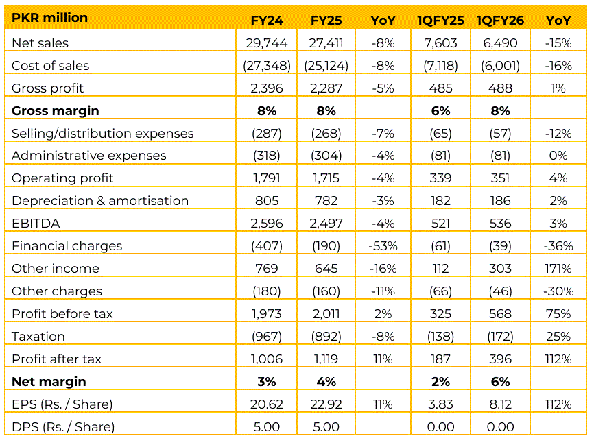 SURC reported earnings per share of PKR 22.92 in FY25 (FY24: PKR 20.62). Furthermore, in 1QFY26, EPS stood at PKR 8.12 (1QFY25: 3.83). Fabric sales increased by approximately 4% in terms of sales value.