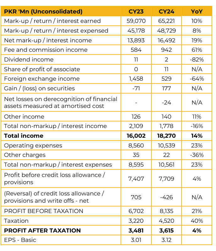Bank of Khyber (BOK) reported earnings per share of PKR 3.12 for CY24, compared to PKR 3.01 in CY23. The Board remains committed to full conversion into an Islamic bank by Dec-2026. To date, 59 conventional branches have transitioned. The deposit base is also shifting, with Islamic deposits rising to 48% of total (32% a year ago), while conventional deposits have reduced to 52% (68% earlier).