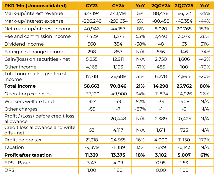 Bank of Punjab (BOP) reported earnings per share of PKR 4.09 for CY24, compared to PKR 3.47 in CY23. Furthermore, in 2QCY25, the company reported earnings per share of PKR 1.53, compared to PKR 0.95 in the same period last year (SPLY). Management stressed that the earnings uplift is structural rather than one-off. Approximately 40% of the Net Interest Income increase stemmed from advances growth and margin expansion, 25% from a 40% improvement in average Current Account balances, 25% from MDR (expected to normalize to 15% over time).