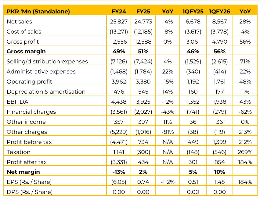 SEARL reported earnings per share of PKR 0.74 in FY25 vs loss per share of PKR 6.05 in FY24. In 1QFY26, the EPS remained PKR 1.45 (1QFY25: 0.51). Sales were slightly lower than FY24 due to supply chain issues and internal consolidation efforts. The de-regulation of prices has been a favorable development, leading to increases in gross margins, particularly for the non-essential portfolio. SEARL operates across Pharmaceuticals, Biopharmaceuticals, Nutraceuticals, Nutrition, Consumer, and Medical Disposals categories.