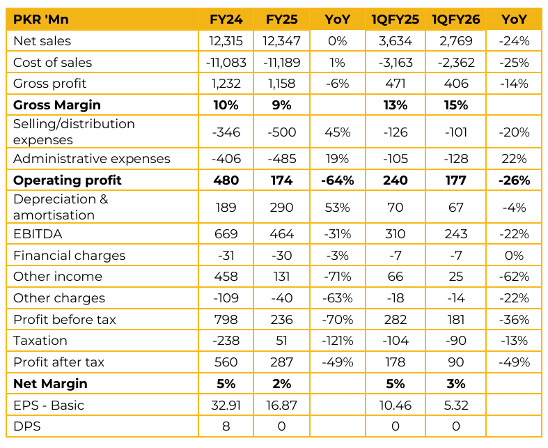 Towellers Limited (TOWL) reported earnings per share of PKR 16.87 for FY25, compared to earnings per share of PKR 32.91 in FY24. Furthermore, in 1QFY26, the company reported earnings per share of PKR 5.32, compared to earnings per share of PKR 10.46 in the same period last year (SPLY).