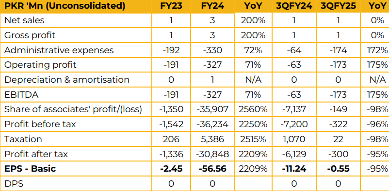 TRG Pakistan limited reported loss per share of PKR 2.45 in FY24 against a loss per share of PKR 56.26 in FY23. Furthermore, in 3QFY25 the company reported loss per share of PKR 0.55 against loss per share of PKR 11.24 in SPLY. For 9MFY25, TRG International reported a profit of PKR 5.259 million, primarily driven by a significant increase in IBEX’s share price during the period. In FY24, TRG recognized a loss of PKR 35.907 million from its associate, TRG International.