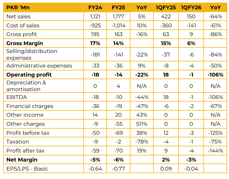 United Brands Limited (UBDL) reported loss per share of PKR 0.77 for FY25, compared to PKR 0.64 in FY24. Furthermore, in 1QFY26, the company reported loss per share of PKR 0.04, compared to earnings per share of PKR 0.09 in the same period last year (SPLY).