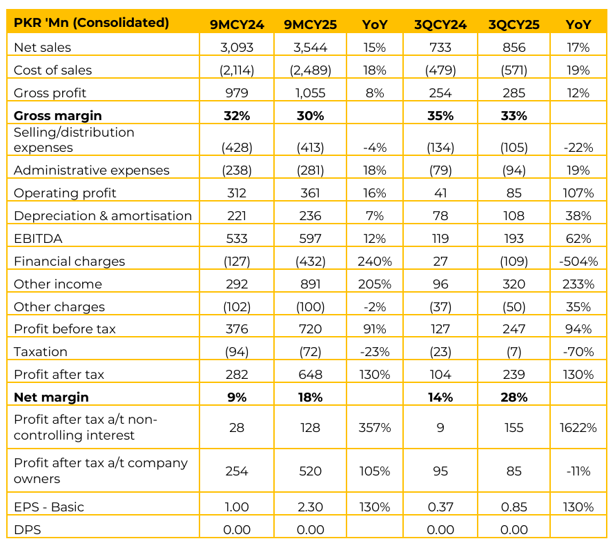 WAVES has reported consolidated earnings per share of PKR 2.30 in 9MCY25 (9MCY24: PKR 1.00). Furthermore, in 3QCY25 the company reported EPS of PKR 0.85 (3QCY24: PKR 0.37). Waves Corporation Limited (WAVES) is a holding company controlling three core businesses. Waves Home Appliances Limited (WAVESAPP) is a 50% owned subsidiary of WAVES.