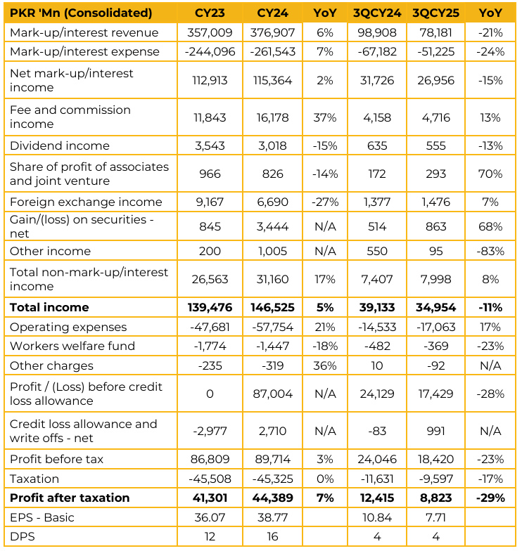 Allied Bank Limited (ABL) reported consolidated earnings per share of PKR 38.77 for CY24, compared to PKR 36.07 in CY23. Furthermore, in 3QCY25, the company reported earnings per share of PKR 7.71, compared to earnings per share of PKR 10.84 in the same period last year (SPLY).
