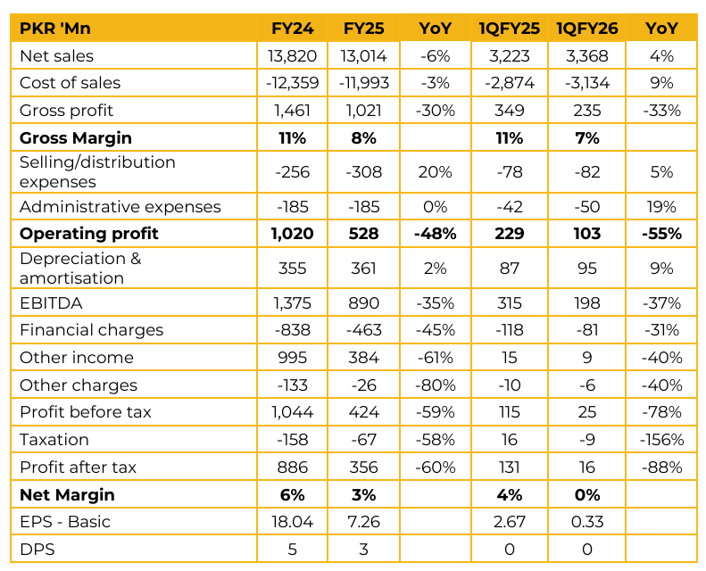 Cherat Packaging Limited (CPPL) reported earnings per share of PKR 7.26 for FY25, compared to PKR 18.04 in FY24. Furthermore, in 1QFY26, the company reported earnings per share of PKR 0.33, compared to earnings per share of PKR 2.67 in the same period last year (SPLY).